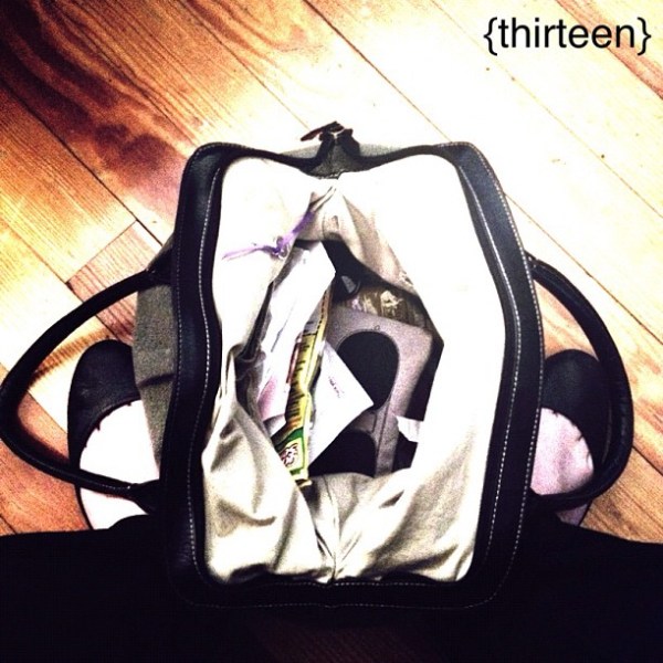 Oh, I had grand illusions about this one. See, I really love looking at what people have in their bag. Like these photos from Fresh Pics? I could look at them every day. It’s very telling, I think. So I was going to pull out all my stuff, organize it all neatly and catalogue it in a photo. But when it came down to it, I had to go meet a friend for lunch and I work up late, and after peering into the deep recesses of said bag I realized I would have to fully clean out my bag just to unearth the things that are in my bag and round up the small creatures who have now signed up for mailing addresses and utilities in my bag in order to take a photo of whats IN MY BAG.