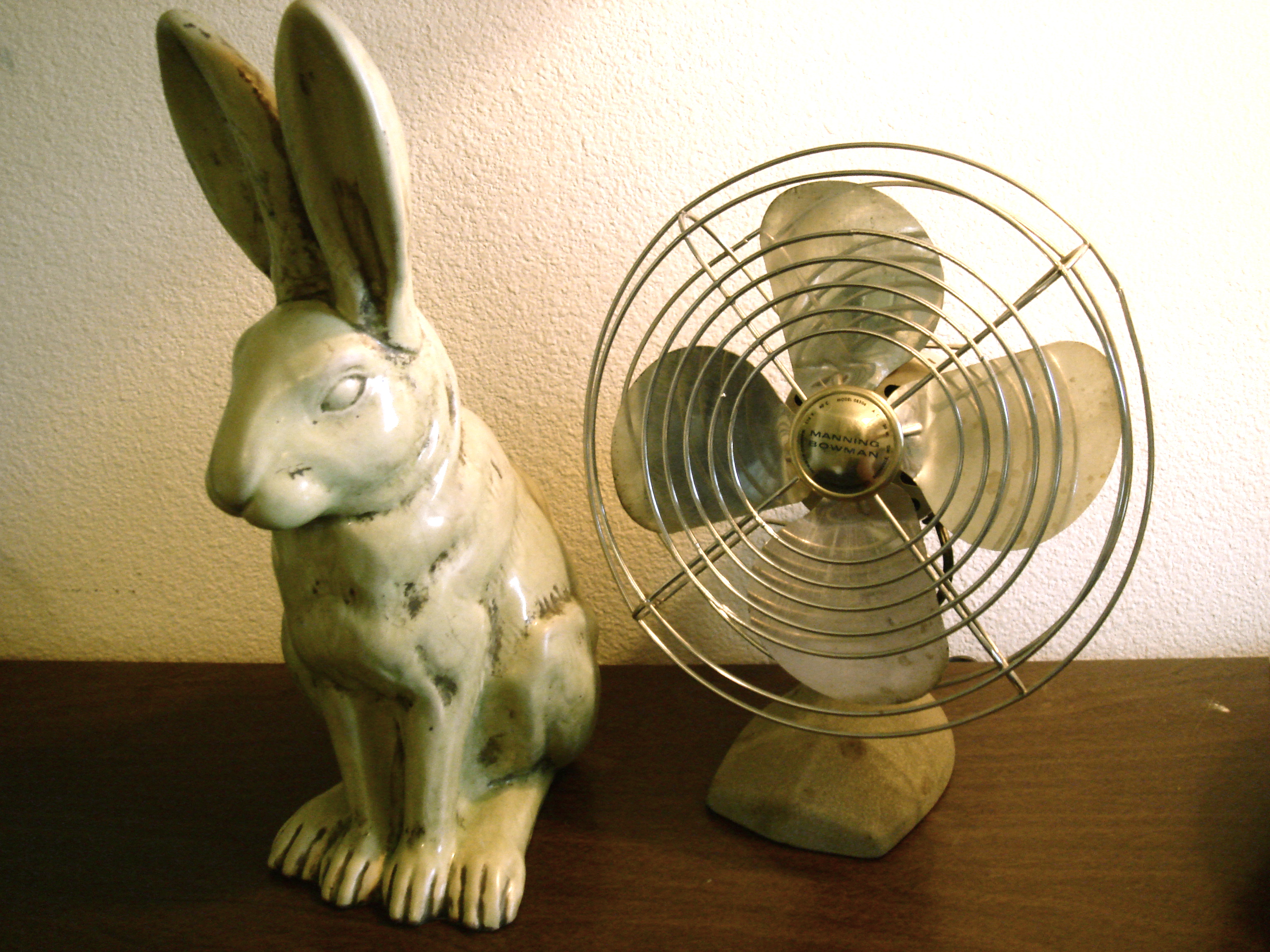 on the dresser in my office sits mr. bunjamin franklin derose, a porcelain rabbit given to us by our good friend ryan and his wife courtney for our wedding.  [seriously, a great wedding present.]  mr. bunjamin gets rather warm in this heat, so he sits in front of the antique (yet working!) fan we snagged at the antique store warehouse planet the other day for $12.  seriously, have you seen the antique store on the corner of academy and constitution?  i think i got lost in there for a few weeks, and reinforcements had to be sent.