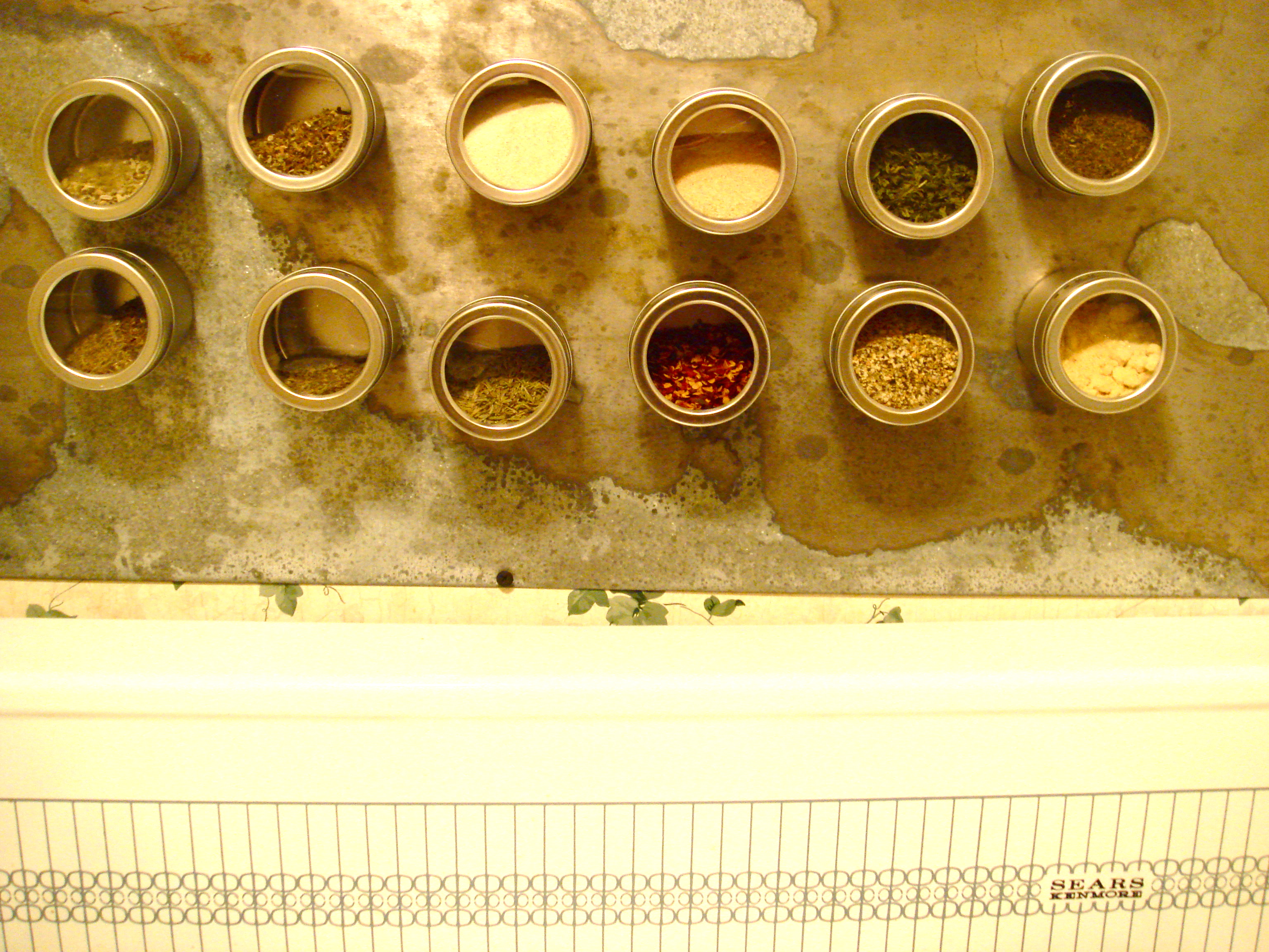 have i mentioned that our apartment has no drawers?  NO DRAWERS.  drawers? nyet.  as you can imagine, this presents a creative challenge regarding where to store things.  our spice rack was taking up valuable real estate on the counter, so my trusty handy boyband (yep, i went there) constructed this magnetic wall for our spicy storage.