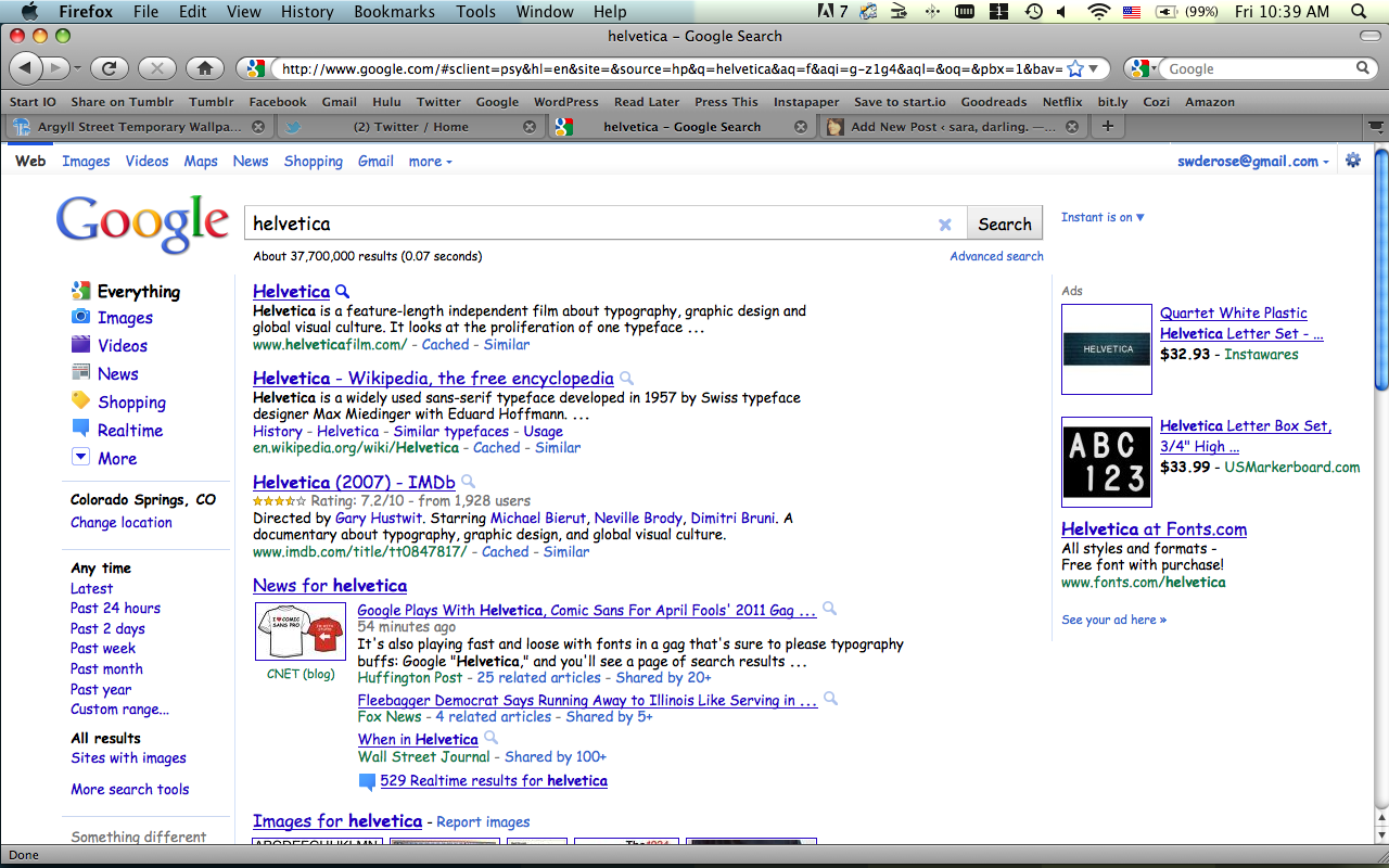 google’s april fools prank. if it’s not immediately obvious [read: if you are not complete design/typography nerds like the boy and i are], when you type in the font “helvetica” in google’s search engine, all results are displayed in the reviled “comic sans” font.