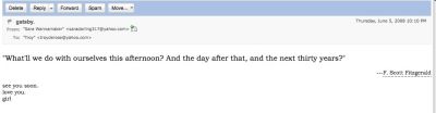 woman, you are incredible. i’m so glad i’ll still get to read your stuff from corvallis. i love the part about idle tuesdays. and the gatsby quote–it’s daisy who says that. and incidentally, are two 90 shillings equal to four PBR’s? whatever, i’m more real after a few beers. and i really, really like you, and i can’t believe it has already been. a. whole. year. wow.